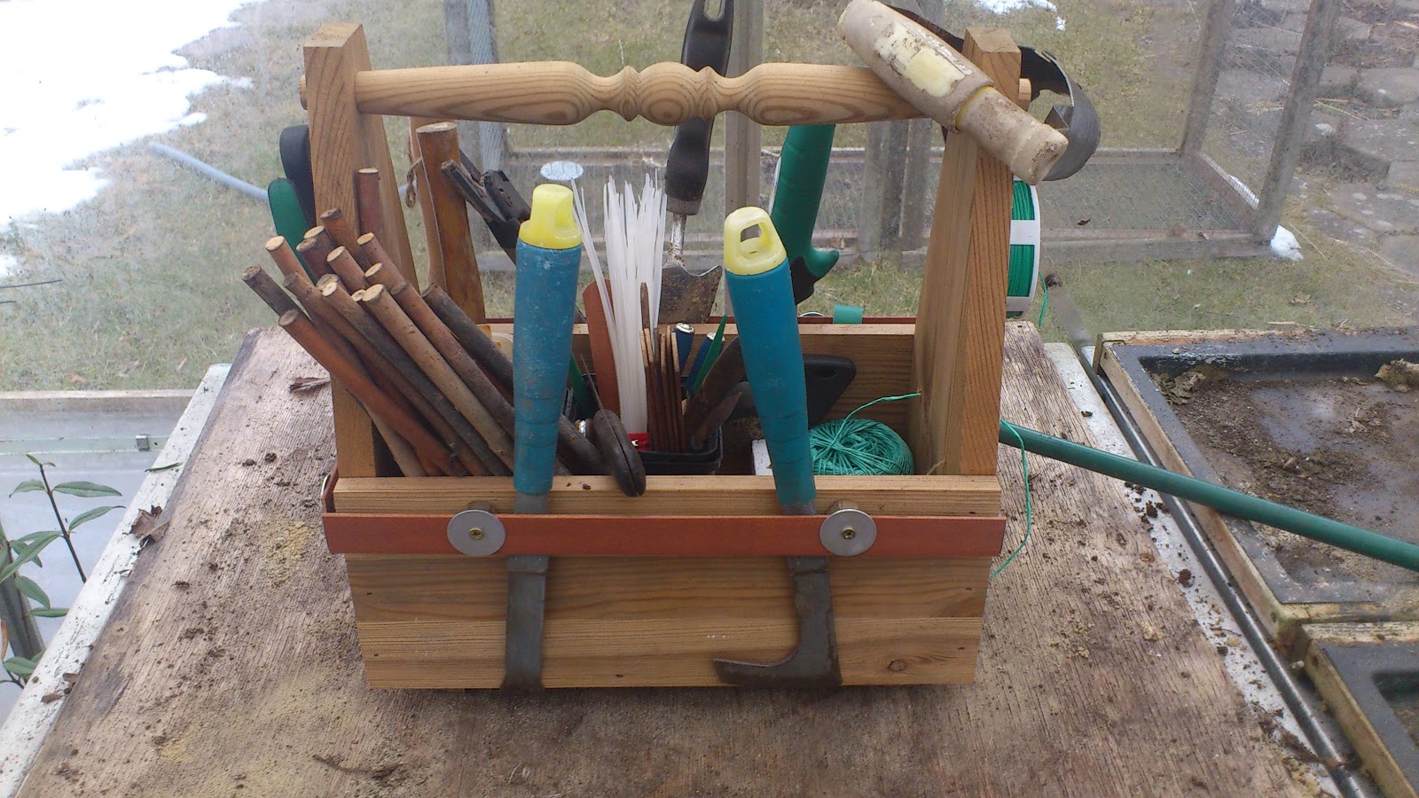 Man skal jo ikke gå ned på udstyr eller gå og lede efter tingene, det har jeg brugt nok tid på, derfor brugte jeg en stund i hulen på at lave denne kasse med det vigtigste til havearbejdet