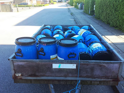 De blå tønder er gode til mange ting. Vi bruger dem bl. a. til foder og til at transportere guldfisk i til marked.