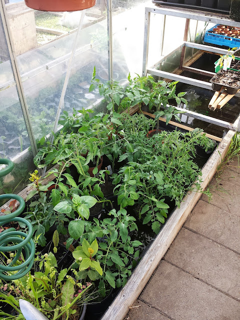 De tomater der skal i bedet i drivhuset får lige en tur i bassinet