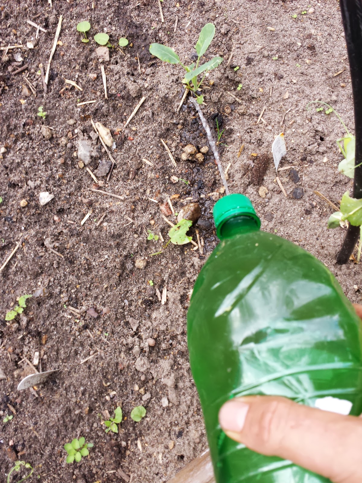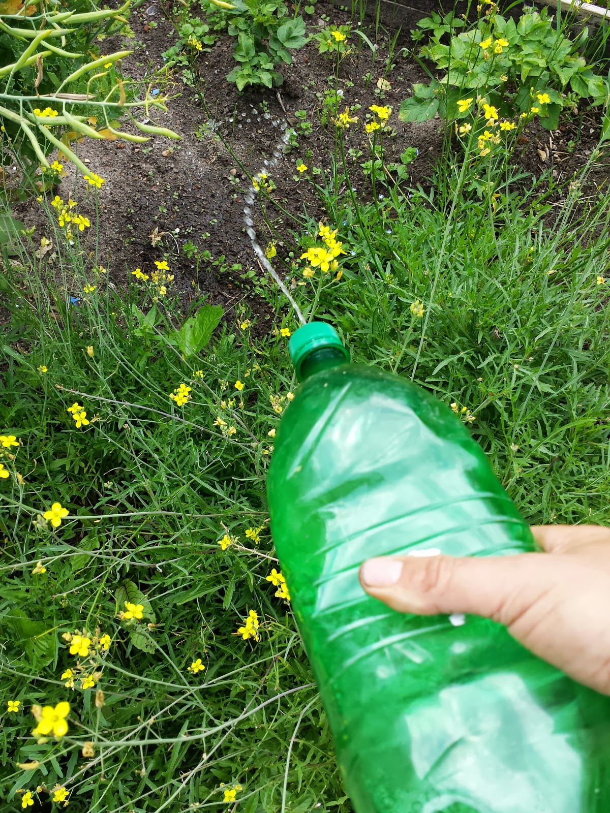 Her i varmen må man udnytte vandet mest muligt så jeg har genbrugt nogle Pepsiplastflasker og monteret dem på en stolpe