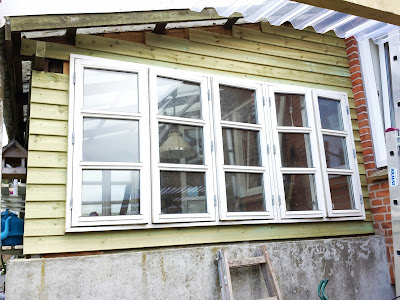 Vinduerne er vi mega glade for og blev da overlykkelige da der dukkede et fag med to vinduer op så vi kunne få vinduer i hele nordsiden - nu går snakken bare om maling. Inde lander vi nok på en knækket hvid, men ude er der 3 muligheder til de hvide vinduer - Hvide vægge, Sorte vægge eller Skagensgule vægge, heldigvis skal træet ikke males i år, men først inden vi lægger nyt tag med udhæng over grillarealet til næste sommer