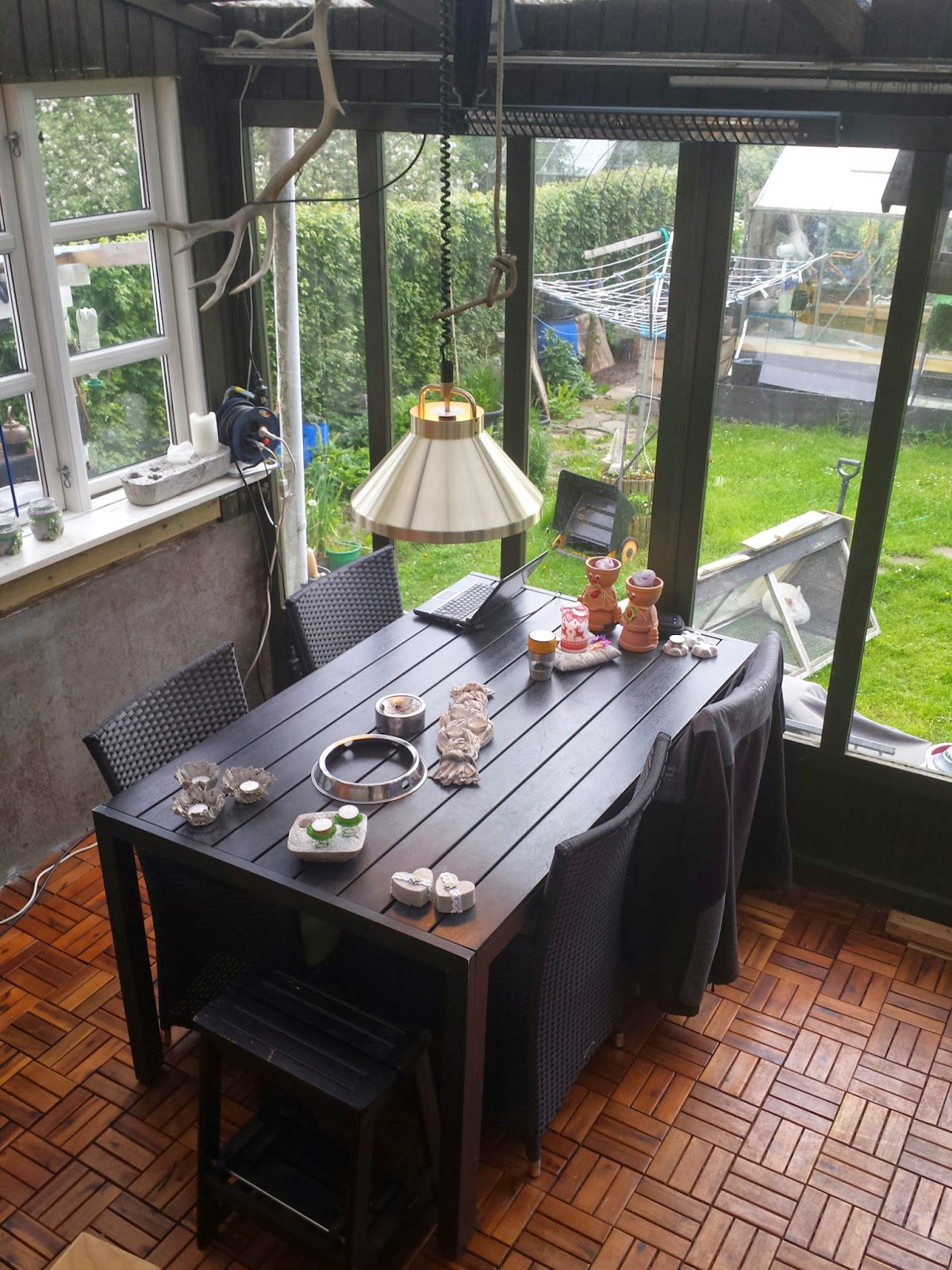 Havestuen danner igen rammen om mange af vores måltider, som du kan se er lampen tændt, det er den døgnet rundt og har været det et års tid nu med dejligt lys man ikke vil slukke for