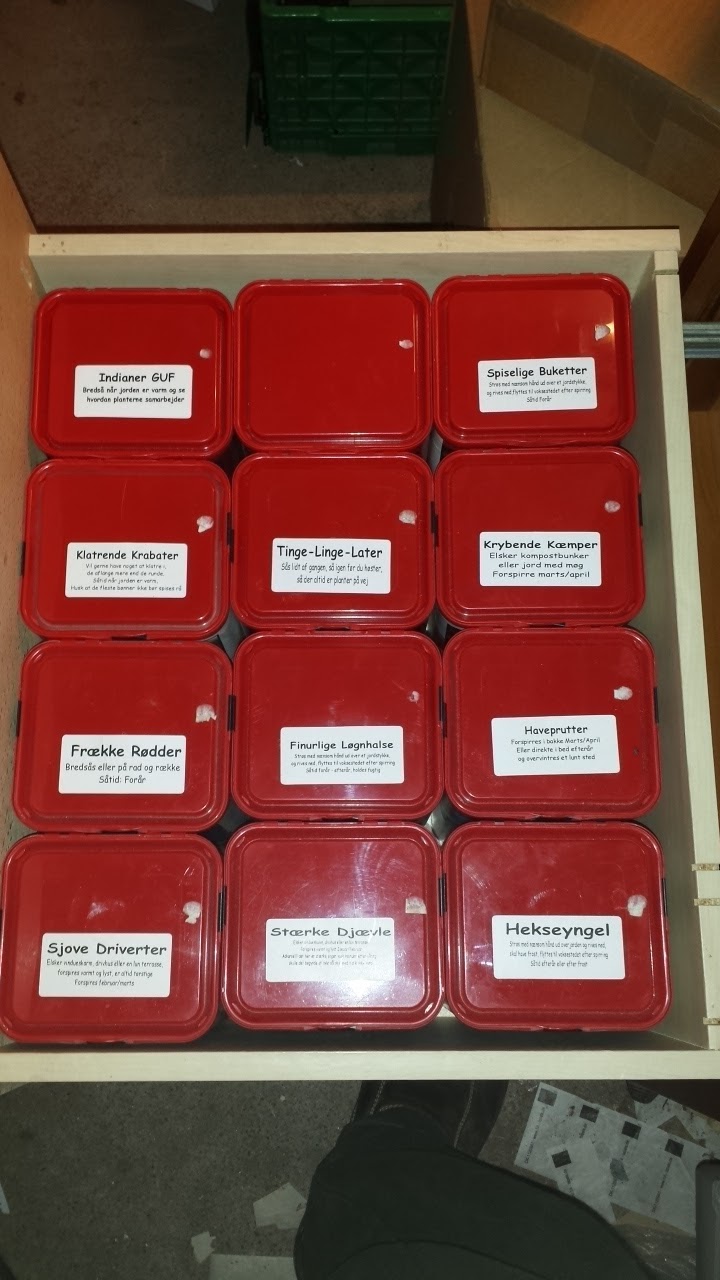 Donationerne er begyndt at dukke op igen så lagrene kan blive fyldt, jeg har fået nye dåser til mine lykkeposefrø og har allerede lavet en ny blandng, INDIANER GUF, en pose der består af høje planter som sås først og klatreplanter som sås lidt senere så de har noget at klatre i, desuden er der en tom plads, det er ikke fordi BLOMSTERBINES BLOMSTERBØRN er udgået, de findes nu i en stor kasse for dem er der altid mange af og er dem jeg afsætter flest af til markeder og foredrag hvor de gør stor lykke